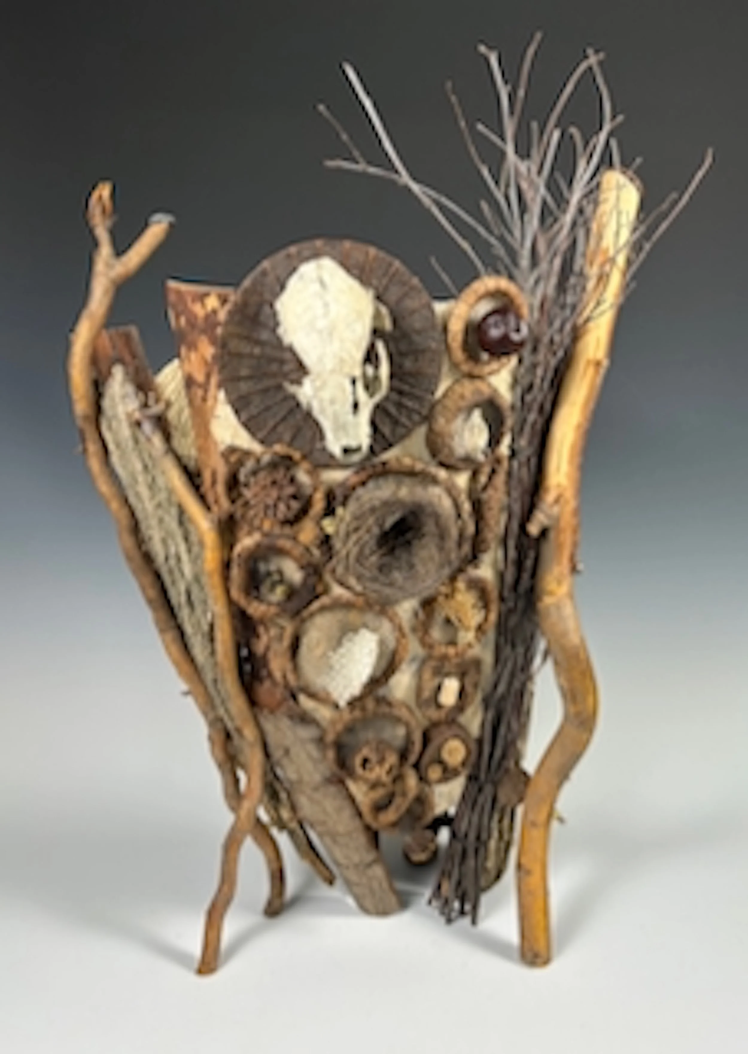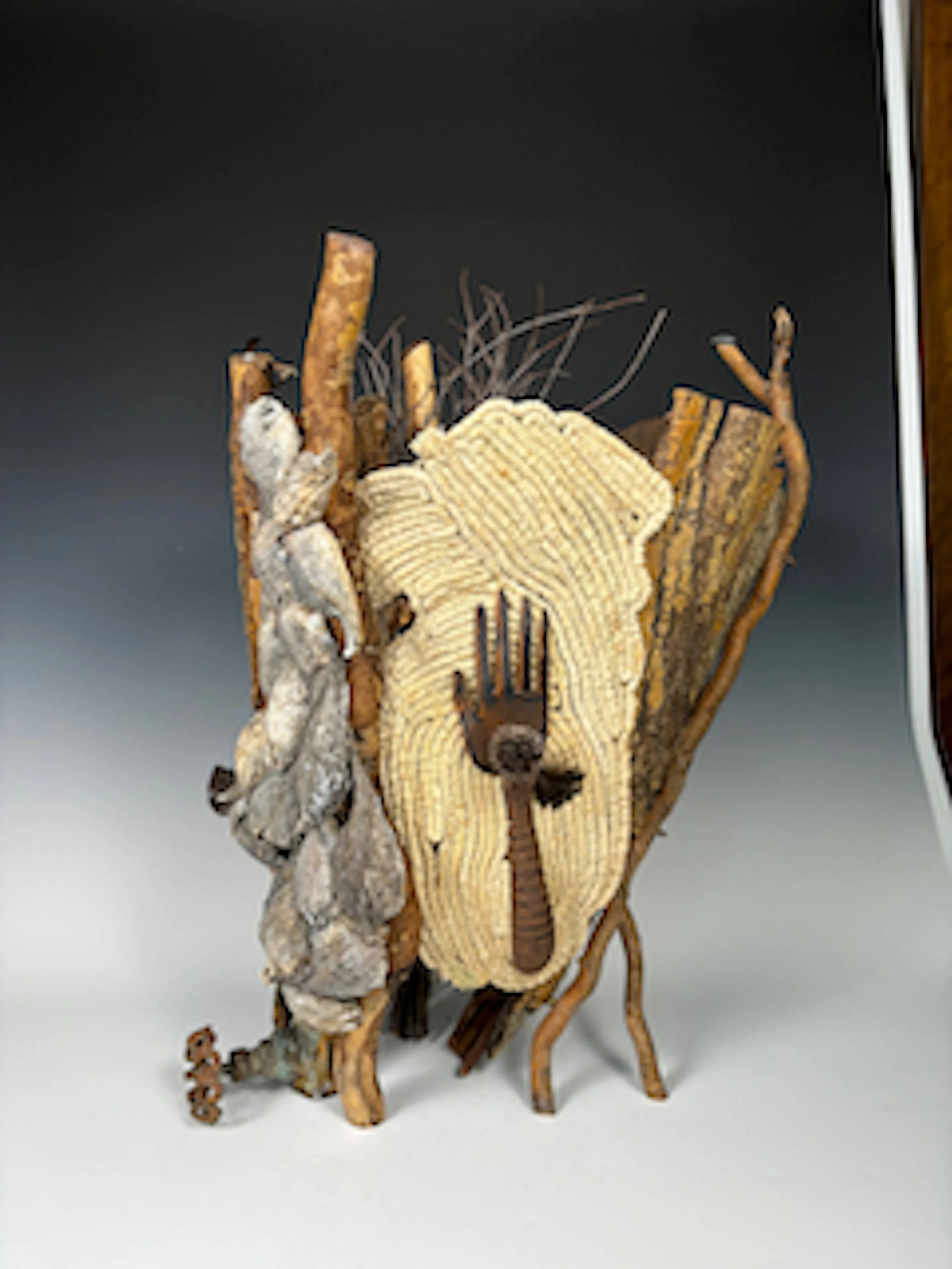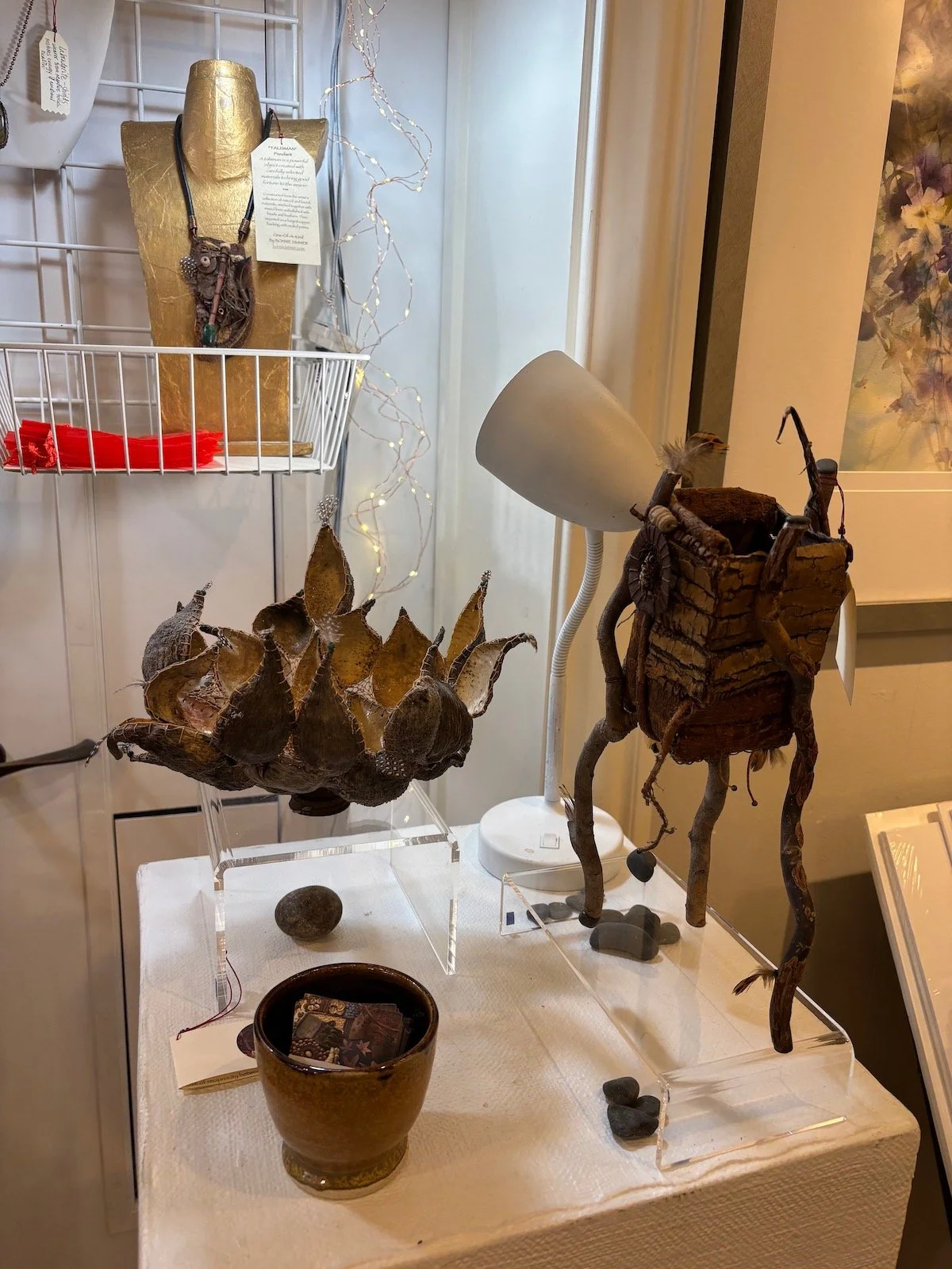 “Totem for Gaia” also in the exhibit. 2022, natural & found materials, waxed linen, gemstone beads, paperclay (hands), acrylic (hands). 24” h. x 14.75” w x 11.5” d.