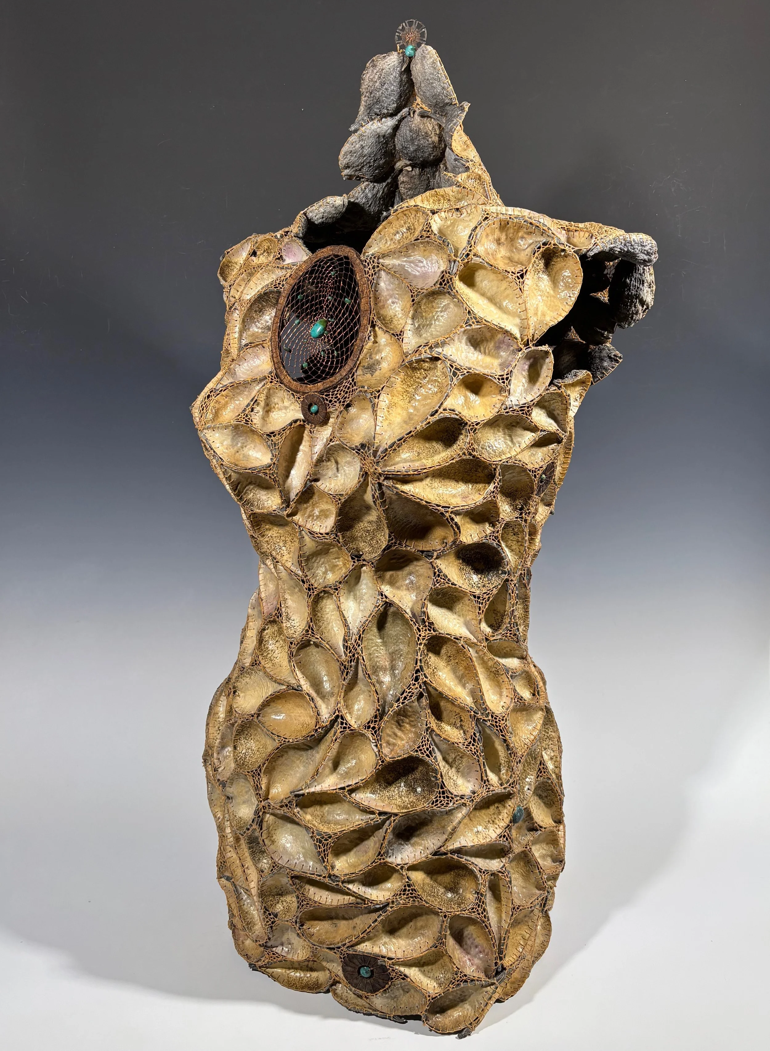 Goddess Mediation 2025, life sized 34” h x 18” w x 15” d. sealed milkweed pods, waxed linen, found objects, gemstones, copper wire.