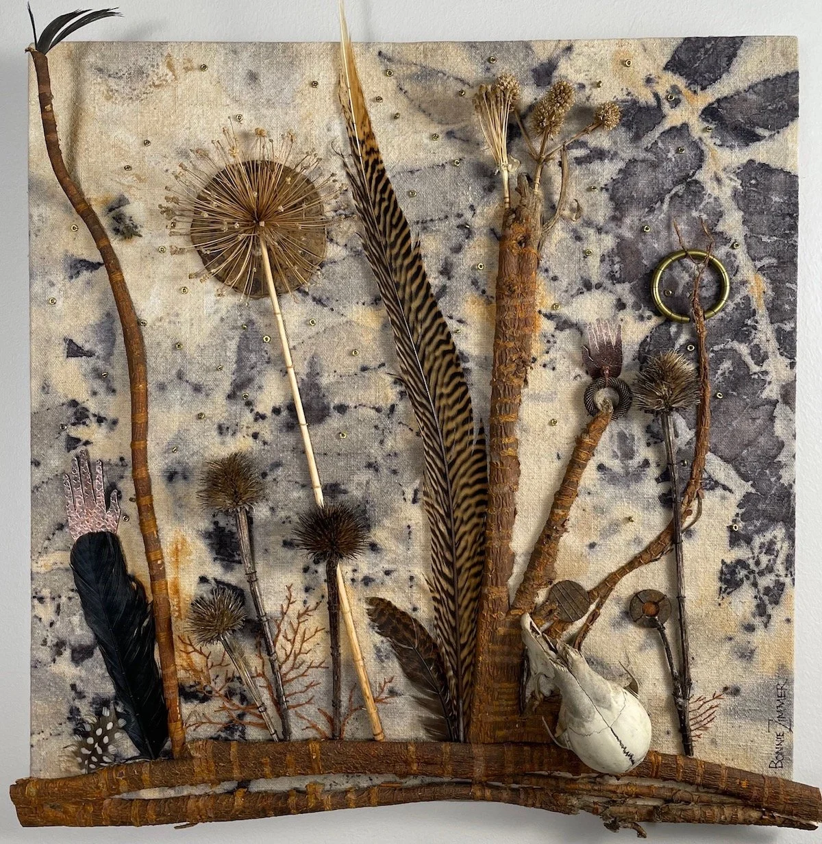 “Another Strange Dream…” assemblage, natural & found materials; embroidery on eco-printed vintage feed sack.
